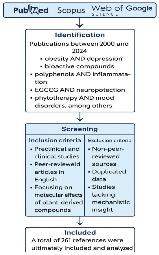 Inclusion and exclusion criteria were applied as follows: (i) included: peer-reviewed articles in English focusing on plant-derived bioactive compounds with mechanistic or interventional relevance to obesity and/or depression, including both preclinical (in vitro and in vivo) and clinical studies; (ii) excluded: non-peer-reviewed articles, review articles, case reports, editorials, conference abstracts, studies without mechanistic data, and duplicates.