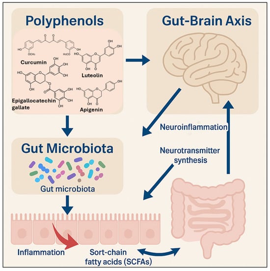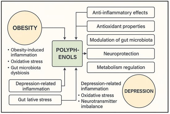 This review specifically focuses on phenolic compounds—especially polyphenols—due to their demonstrated efficacy in targeting inflammation, oxidative stress, metabolic dysregulation, and neurochemical imbalances that are commonly shared between obesity and depression (Figure 2).