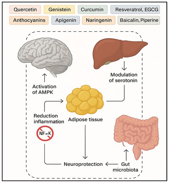Molecular mechanisms through which selected bioactive compounds (e.g., quercetin, genistein, and curcumin) act on the brain–gut–adipose axis to counteract inflammation, enhance AMPK activity, and modulate serotonin and neuroinflammatory pathways.