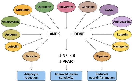 Synergistic actions of plant bioactive compounds on AMPK and BDNF signaling pathways, contributing to adipocyte reduction, improved insulin sensitivity, and neuroprotection.