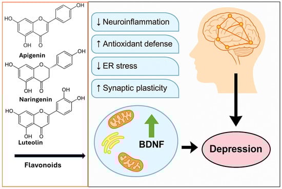 Apigenin, a flavonoid that is abundant in citrus fruits, exerts antidepressant effects through multiple mechanisms, including the inhibition of inflammatory mediators (iNOS, COX-2), the downregulation of NF-κB signaling, and the activation of neurotrophic pathways, such as p38/MAPK and PI3K/Akt [133,134,135,136,137]. Animal studies have shown increased hippocampal BDNF expression following apigenin administration, highlighting its neuroplasticity-enhancing potential.