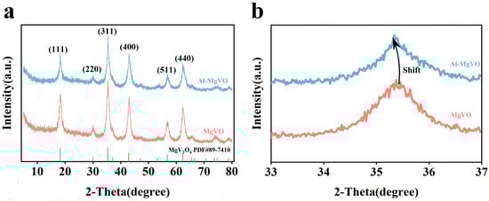 (a) XRD diffraction of MgVO and Al-MgVO; (b) enlarged view of the diffraction peak (311).