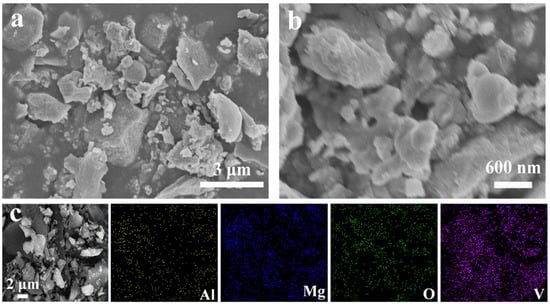 (a,b) SEM patterns of Al-MgVO; (c) EDS mapping of Al-MgVO.