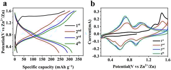 (a) Charge and discharge curve of the first four rounds of Al-MgVO; (b) the CV cycle curve corresponding to (a).