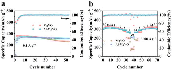 To comprehensively evaluate the electrochemical performance of the synthesized materials, the cycling behaviors of Al-MgVO and pristine MgVO cathodes were investigated at a current density of 0.1 A g−1, as illustrated in Figure 6a. The Al-MgVO electrode exhibited an unusually low initial discharge capacity of 13.5 mAh g−1, followed by a rapid increase to a charge capacity of 338.5 mAh g−1, and eventually reached 341.6 mAh g−1 after several cycles. After seven cycles, the Coulombic efficiency stabilized at nearly 100%, indicating that the electrode underwent an effective activation process and achieved highly reversible zinc-ion storage. Notably, after 53 charge–discharge cycles, the specific capacity remained at 315.1 mAh g−1, corresponding to a high capacity retention of 92.2%, which reflects excellent long-term cycling stability.