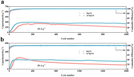 Then the cycling stability of Al-MgVO was systematically evaluated at high current densities of 10 A g−1 and 20 A g−1, as shown in Figure 7a and Figure 7b, respectively. These evaluations are crucial for assessing the material’s practical applicability in AZIBs. At a current density of 10 A g−1, Al-MgVO exhibited an initial discharge capacity of 11.4 mAh g−1, and an initial charge capacity of 36 mAh g−1. Interestingly, during subsequent cycles, the discharge and charge capacities increased sharply, reaching 271.6 mAh g−1, and the Coulombic efficiency (CE) gradually approached 100%. This remarkable capacity enhancement can be attributed to the gradual activation of the electrode material, which is mainly driven by an irreversible phase transition in the electrode. This phase transition led to an increase in the oxidation state of vanadium (V), which subsequently facilitated the higher electrochemical performance of Al-MgVO. After 1000 cycles, the material retained a capacity of 254.3 mAh g−1, corresponding to a high capacity retention of 93.6%. This excellent cycling performance demonstrates the material’s potential for high-rate cycling stability and is a clear indication of the favorable influence of aluminum ions in stabilizing the MgVO structure.