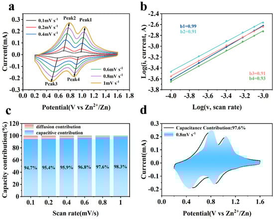 (a) CV of Al-MgVO at different sweep speeds; (b) b-value; (c) pseudocapacitance contribution at different scan rates; (d) pseudocapacitance contribution at 0.8 mV s−1.