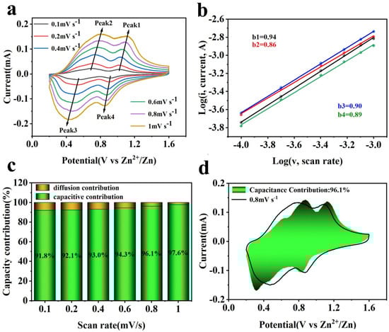 (a) CV of MgVO at various scan rates; (b) b-value analysis; (c) pseudocapacitive contribution at different scan rates; (d) pseudocapacitive contribution at a scan rate of 0.8 mV s−1.