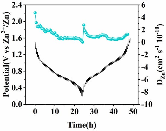As shown in Figure 10, the diffusion coefficient of Al-MgVO is observed to be in the range of 10−9 to 10−10 cm2 s−1. In contrast, the diffusion coefficient of Zn2+ in the MgVO material is in the range of 10−11 to 10−12 cm2 s−1. This significant difference can be attributed to the Al doping, which increases the electronegativity of the material and enhances its adsorption ability. This, in turn, facilitates a faster charge transfer rate, leading to an accelerated diffusion of Zn2+ within the Al-MgVO structure. The increased diffusion rate of Zn2+ in Al-MgVO suggests that Al doping not only improves the electrochemical performance by enhancing ion diffusion but also contributes to the material’s superior rate capability. These results provide a clear indication that Al-MgVO exhibits better electrochemical kinetics compared to its MgVO counterpart, which is advantageous for high-performance AZIBs.