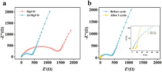 The EIS spectra of Al-MgVO and MgVO before cycling are shown in Figure 11a. It can be observed that the charge transfer resistance of Al-MgVO is significantly lower than that of MgVO, suggesting that the insertion of Al3+ ions has effectively reduced the resistance of MgVO. Lower charge transfer resistance is favorable for the migration of Zn2+ ions, leading to improved rate performance and enhanced cycling stability at high current densities in Al-MgVO. This improvement can be attributed to the incorporation of Al3+ ions, which optimize the electronic structure of the material. Furthermore, the formation of stable Al–O bonds between Al and oxygen results in a substantial reduction of the electrostatic interaction between Zn2+ ions and the host material, thereby enhancing the conductivity of MgVO and promoting its electrochemical performance.