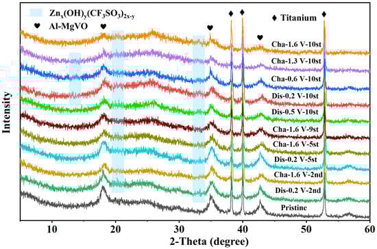 Interestingly, several additional weak diffraction peaks emerge at 2θ values of approximately 13.3°, 20.4°, and 33.2° during the 2nd, 5th, and 10th cycles. These peaks are consistent with the formation of Znx(OH)y(CF3SO3)2x−y, a common byproduct attributed to proton (H+) insertion during the discharge process, as reported in the previous literature [62]. The presence of these peaks suggests that minor side reactions involving electrolyte decomposition or competitive H+ intercalation may occur during the Zn2+ storage process.