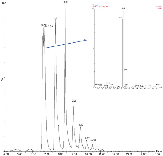 Because weak signals were obtained using standard LC-CIS-MS techniques, analysis of the complex polysulfane mixture was performed by ultra-performance liquid chromatography (UPLC) silver coordination ion spray mass spectrometry ((Ag+)CIS-MS) (Figure 2) as well as by 19F NMR and direct analysis in real time–mass spectrometry (DART-MS) techniques, as described more fully in the experimental section and elsewhere [55]. Reversed phase HPLC analysis of the mixture indicated the presence of higher polysulfides containing up to 26 sulfur atoms.