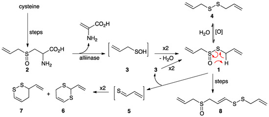 Enzymatic formation of allicin (1) from alliin (2) by way of 2-propenesulfenic acid (3); synthesis of allicin by oxidation of diallyl disulfide (4); conversion of 1 to ajoene (8); decomposition of 1 to vinyl dithiins (6 and 7) via intramolecular elimination to thioacrolein (5). In addition to 2, garlic cloves contain methiin (MeS(O)CH2CH(NH2)CO2H) and isoalliin (MeCH=CHS(O)CH2CH(NH2)CO2H), which give rise to associated structures with methyl and 1-propenyl groups [2,3,4].