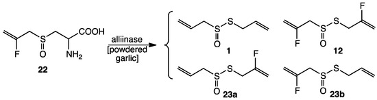 Enzymatic conversion of 2-fluoroalliin 22 to a mixture of 1, 12 and 23a,b. Alliin, present in the unpurified powdered garlic, provides the C3H5 group.