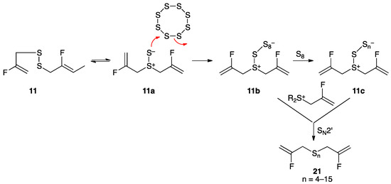 Conversion of disulfide 11 to polysulfane mixture 21 through condensation with molten sulfur. Several equivalents of S8 can react, losing different numbers of sulfur atom groupings, followed by SN2′ reaction with 2-fluoroallyl sulfonium species giving polysulfane mixture 21. By other techniques, compounds containing up to 26 sulfur atoms could be observed.