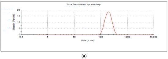 The average hydrodynamic size and zeta potential were measured as 192.4 nm (Figure 1a) and 40.5 mV (Figure 1b), respectively, and the overall morphology of the nanosystem was found to be roughly spherically shaped as per smooth electron microscopy imaging (SEM) (Figure 1c). Due to the 5 kV EHT applied on the nanosystem in imaging as compared to 3 kV EHT, various layers are observed on the nanosystem. The outermost layer of the nanosystem melted, which could be attributed to mannan, which is heat sensitive, confirming the presence of mannan on the surface. The size was thus in the desired 100–200 nm size range for macrophage internalization [33]. Furthermore, the cationic potential and presence of mannan will allow for high uptake of the nanoparticles by the macrophage’s negatively charged sialic acid and mannose receptors, respectively [28,34]. The nanoparticles’ Polydispersity Index (PDI) was recorded as 0.199, indicating colloidal stability and minimal aggregation in dispersed aqueous media. The PDI and the zeta potential concurrently demonstrated viability as a systemic nano-drug delivery system. The high surface charge, while beneficial for cellular uptake, may promote nonspecific interactions with biological components and warrants further studies, including serum protein binding and cytotoxicity assays.