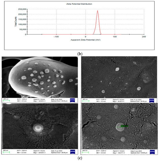 (a) A graphical representation of BDQ-loaded, mannan-conjugated COS NPs’ average hydrodynamic size, (b) surface potential, and (c) smooth electron microscopy (SEM) images at magnification (top left (120.00 kx, EHT = 3.00 kV); top right (63.02 kx, EH 5.00 kV); bottom left (126.48 kx, EH 5.00 kV); bottom right (120.07 kx, EHT = 5.00 kV).