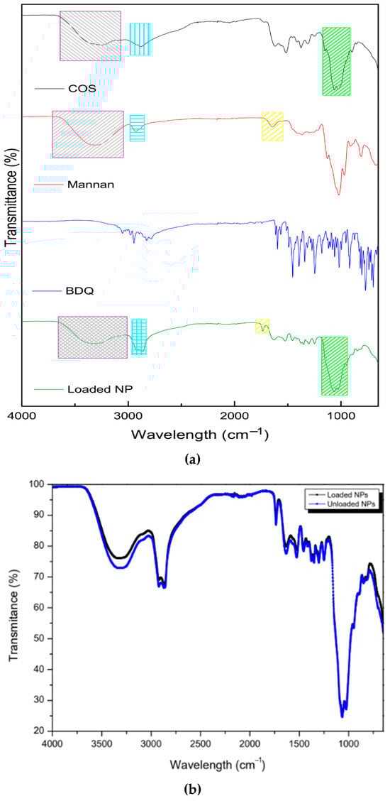 FTIR images showing (a) the pristine mannan, chitosan oligosaccharide lactate, bedaquiline, loaded NPs, and (b) unloaded NPs vs. drug-loaded NPs.