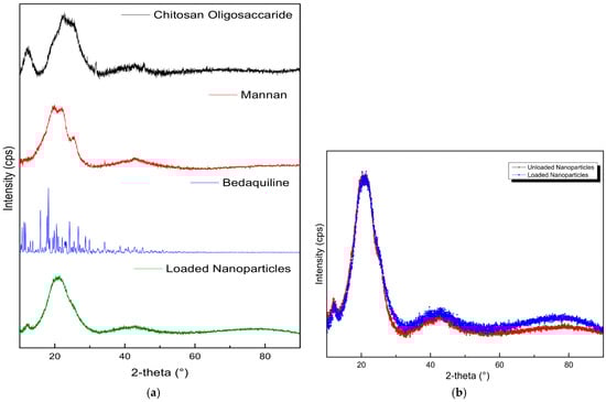 X-ray diffraction images of (a) the pristine mannan, chitosan oligosaccharide lactate, bedaquiline, loaded NPs, and (b) unloaded NPs vs. drug-loaded NPs.