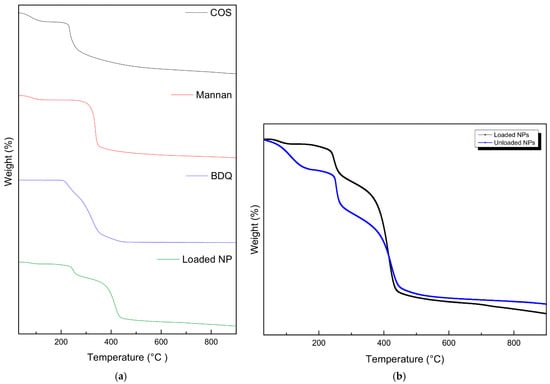 Thermogravimetric analysis of (a) the pristine mannan, chitosan oligosaccharide lactate, bedaquiline, loaded NPs, and (b) unloaded NPs vs. drug-loaded NPs.