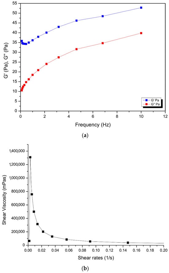 Rheological images showing (a) frequency sweep and (b) viscosity sweep of the nanogel.