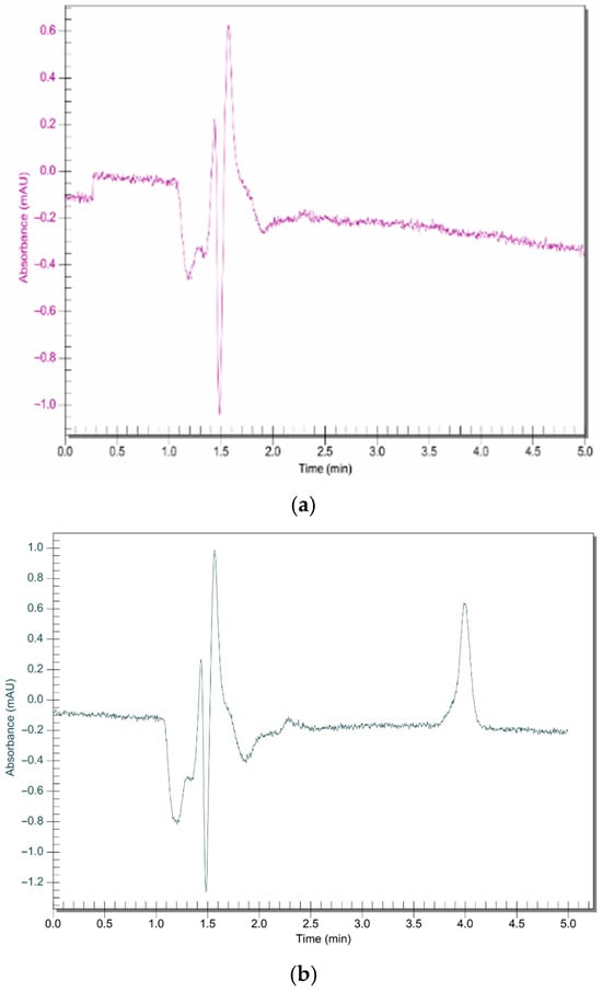 RP C18 HPLC chromatograms for (a) unloaded nanosystem and (b) bedaquiline-loaded nanosystem (Rt = 4.01; concentration= 0.2 ug/mL). Run time of 5 min using a mobile phase of 95:5 (organic phase (containing methanol 85:15 acetonitrile)/phosphate buffer) at a flow rate of 1 mL.min−1 and a detection wavelength of 275 nm.