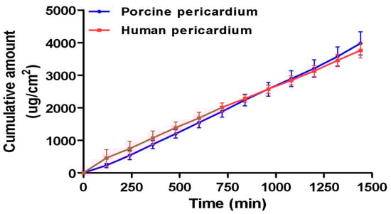 The RP-HPLC method successfully quantified the amount of bedaquiline that is diffused across the pericardium without interference from the nanoparticle components (Figure 7). Human and porcine pericardia displayed comparable results in their average cumulative permeation graphs (Figure 8). Steady-state flux values were reached as quickly as 2 h across both human and porcine pericardia. The steady-state fluxes were calculated to be 2.889 and 2.346 µg.cm−2.min−1 for porcine and human pericardia, respectively; the apparent permeability coefficients were calculated to be 2.66 × 10−4 cm.min−1 and 2.16 × 10−4 cm.min−1 for porcine and human pericardia, respectively. The lag phases were 52.72 min and 0 min for porcine and human pericardia, respectively. Bedaquiline diffusion across porcine pericardium was found to be slightly higher compared to human pericardium.
