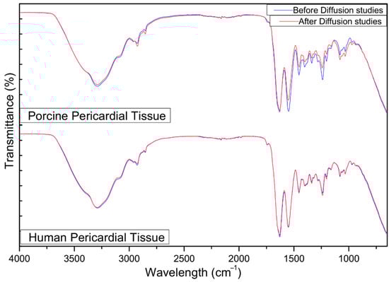 Pericardium contains mainly Type-1 collagen, glycoproteins, and glycosaminoglycans [52]. This is concurrent with the characteristic absorption peaks between 3000 cm−1 and 2800 cm−1 showing lipid hydrocarbon absorption. The peak at 1630 cm−1 is attributed to amide I-C=O stretching of the backbone of the proteins. Furthermore, the peak at 1550 cm−1 indicates an amide II bond, showing N-H bending coupled to C-N stretching. The 1454 cm−1 peak shows asymmetric and symmetric C-H bending from CH2 and CH3 on proteins. The 1400 cm−1 peak is indicative of C=O vibrations of COO− from free amino acids and polypeptides in the pericardial structure. Amide III from proteins is characterized by the 1338 cm−1 peak. The 1033 cm−1 peak indicates C-O vibrations from polysaccharides in glycoproteins and glycosaminoglycans [53]. There was immutability in the transmittance of the bonds on the mesothelial pericardial tissue across the range of 4000–650 cm−1 over 20 scans before and after the diffusion study (Figure 9). There were no statistically significant differences (p > 0.05) before and after the diffusion study, suggesting that tissue integrity was not compromised by the nanoparticle or collecting media.
