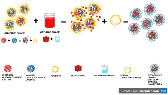 The bedaquiline-loaded mannan–COS NPs were prepared by a one-step ionic gelation probe sonication method, as illustrated in Figure 10. COS (200 mg) was added into 10 mL of distilled water, followed by the addition of mannan (50 mg) into the solution and stirring for 30 min. Tween 80 (200 μL) was added dropwise into the solution until a homogenous solution was obtained. Bedaquiline (5 mg) was dissolved in 5 mL of DCM, and the aqueous solution was added to the organic solution, followed by stirring at 1500 rpm for 20 min. sTPP (7.5 mg) was dissolved in 5 mL of DW and filtered through a 2.2 µm filter. The sTPP was added dropwise into the prepared bedaquiline solution at a 0.2 mL.min−1 drop rate, after which the solution was stirred for 24 h. The resultant solution was then homogenized at 5000 rpm for 10 min. The suspension obtained was sonicated (CV33 VibraCell, Sonics and Materials, Inc., Danbury, CT, USA) for 2 min at 4.8 million Joules and 40% amplitude. The suspension was frozen at −80 °C for 48 h and then subsequently lyophilized for 12 h (FreeZone-50C Benchtop Freeze Dryer, Labconco, Kansas City, MO, USA).