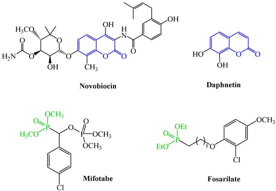 Coumarins show great potential as anticancer agents owing to their ability to interact with multiple molecular signaling pathways and inhibit human cancer cell lines [1,2,3,4]. The activities of coumarin derivatives comprise the inhibition of tumor cell proliferation, the modulation of cell-mediated signaling, the suppression of angiogenesis, and apoptosis execution. Coumarins can also repress the expression of some oncogenes and induce oxidative stress through free radical generation, which leads to proapoptotic activities. They also inhibit the growth of tumor cells by blocking cell division at the G0/G1 and G2/M phases [5]. The recent modification of coumarins by adding different pharmacophore prodrugs is a new area of interest. These changes are focused on adding multi-directional activity and improving pharmacokinetic parameters, like lipophilicity and bioavailability. The resulting hybrid compounds are highly promising, as exemplified by novobiocin, which is made up of a noviose sugar, a coumarin backbone, and a benzoyl side chain. Novobiocin’s original use as an antibiotic has come under scrutiny, but the drug has proved useful against tumors that are resistant to PARP inhibitors, especially in patients with BRCA1 or BRCA2 mutations (Figure 1) [6,7].