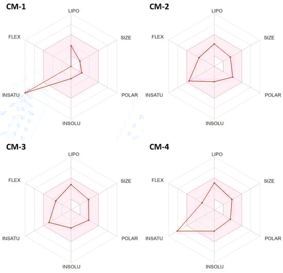 In terms of the bioavailability, radar plots (Figure 3) reflecting the combined influence of lipophilicity, molecular weight, polarity, solubility, and molecular shape highlight that compounds CM-2 and CM-3 exhibit optimal parameters values conducive to good bioavailability. Moreover, moderate levels of these properties suggest that further structural modification remain possible. All compounds still possess considerable space for molecular size expansion—which typically accompanies structure optimization. Such modifications, affecting polarity, lipophilicity, and solubility—can be introduced, without exceeding the critical thresholds or significantly compromising bioavailability. The addition of appropriate substituents to CM-2 and CM-3 may also improve the fraction of sp3-hybridized carbons (INSATU parameter), without surpassing the acceptable limit for rotatable bonds (FLEX < 9). In particular, such optimization is especially desirable for structure CM-4, given its low sp3 carbon fraction.