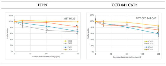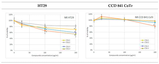 The lowest cytotoxic activity on tumor HT29 cells was observed for coumarin CM-2. At the highest concentration applied, the viability decreased by about 17.5% compared to the control. The same concentration of coumarin CM-4 decreased the viability of HT29 cells by about 45% in comparison to the untreated control (Figure 5).