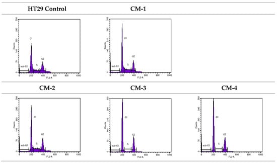 Coumarins CM-1, CM-2, and CM-4 increased the number of HT29 cancer cells in the sub-G1 phase. This suggests that the tested substances stimulated the apoptosis process. Cells were blocked in the G1 phase after incubation with coumarins CM-3 and CM-4. Therefore, a significant decrease in the number of cells in the S phase was observed in the same samples compared to the untreated control (Figure 6 and Table S1).