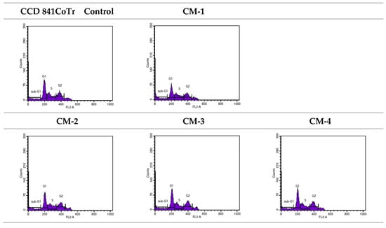 In the case of normal intestinal epithelial cells, an increase in the number of cells in the sub-G1 phase was also observed after their incubation with coumarins CM-1, CM-2, and CM-4. In the case of coumarin CM-1, an approximately 4% decrease in the cell’s number in the G1 phase was also demonstrated compared to the control. Coumarins CM-3 and CM-4 also blocked the transition of cells from the S phase to G2. However, this was not as strong a blockade as in the case of cancer cells. There were no significant changes in the number of both normal and neoplastic cells in the G2 phase compared to the control (Figure 7 and Table S1).