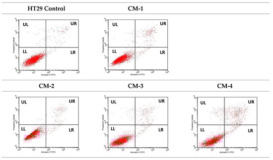 The most pronounced effect on changes in the viability of HT29 cancer cells was exerted by coumarin CM-4. It caused a decrease in cell viability by about 11.6% compared to the untreated control. These cells died mainly by late apoptosis (Figure 8 and Table S2).