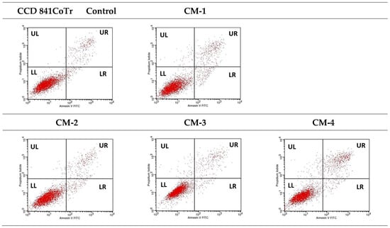 Apoptosis/necrosis levels after the incubation of CCD 841CoTr cells with tested coumarins at a 200 μg/mL concentration. Flow cytometry analysis after cell staining with annexin V-FITC and propidium iodide. Only representative dot plots are presented. An−/PI+ necrotic cells are located in the UL Quad, An+/PI+ late apoptotic cells in the UR Quad, An−/PI− viable cells in the LL Quad, and An+/PI− early apoptotic cells in the LR Quad.