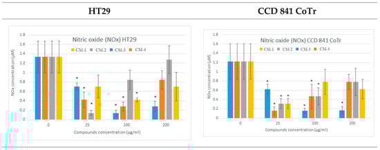 In cancer HT29 cell cultures, coumarin CM-3 reduced the amount of NOx with increasing concentration, coumarin CM-4 increased the amount of detected NOx with the use of a higher concentration of the compound, coumarin CM-2 stimulated the release of higher amounts of NOx with increasing concentration, and coumarin CM-1 did not show a trend in NOx level changes with an increasing concentration of the tested compound (Figure 10).