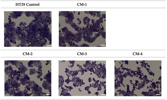 May–Grünwald–Giensa (MGG) staining of HT-29 tumor and CCD 841 CoTr normal colon epithelial cells. Cells were incubated for 24 h with tested coumarins at a 200 µg/mL concentration. Magnification 100×. Bar = 50 µm.