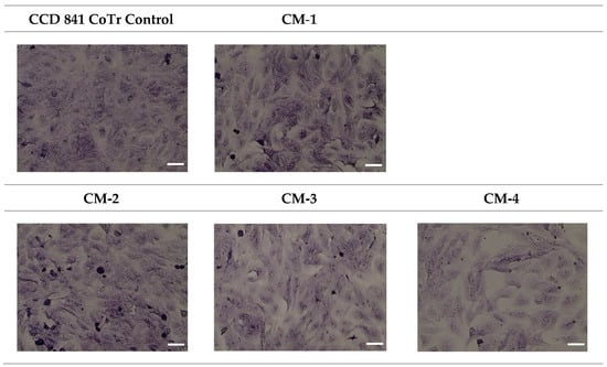 The staining of cells using the MGG method confirmed the observations of cell viability made using spectrophotometric methods. Cancer cells after incubation with coumarins CM-3 and CM-4 showed reduced culture density, reduced cell adhesion to the substrate, and a reduced degree of culture compactness compared to the control. Coumarins CM-1 and CM-2 only caused a decrease in the number of cells compared to the untreated control. Normal cells did not show significant changes in morphology compared to the control after incubation with the tested compounds. Only a decrease in cell culture density was observed, especially after incubation with coumarin CM-4 (Figure 11).