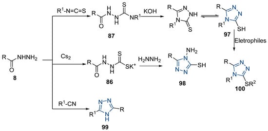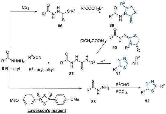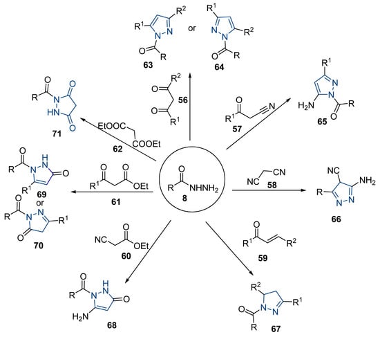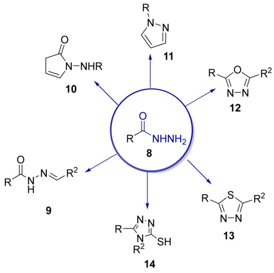 Over time, hydrazides 8 were found to be great precursors of other bioactive compounds such as hydrazine–hydrazones 9 [25,26]. Hydrazides 8 were also employed as building block synthons of different classes of heterocycles, like pyrrolones 10 [27,28], pyrazoles 11 [29,30], oxadiazoles 12 [31], thiadiazoles 13 [30,32], triazoles 14 [30], by cyclization or cycloaddition reactions with other reagents [28,33] (Figure 2). These hydrazide derivatives similarly revealed a wide range of biological activities, including antitumor [34,35,36,37], antimicrobial [38], antifungal [39], antimalarial [2], antileishmanial [40], anti-inflammatory [41], antidiabetic [42,43] and antioxidant [44] properties. They also showed herbicide activity or were used as dyes [45,46].