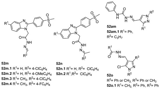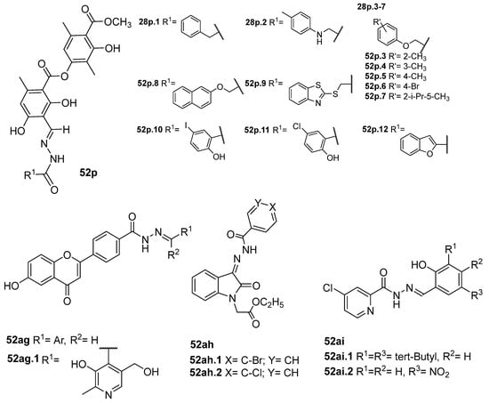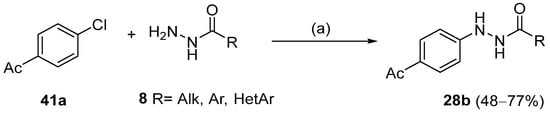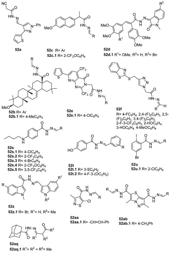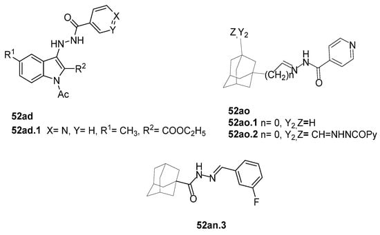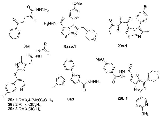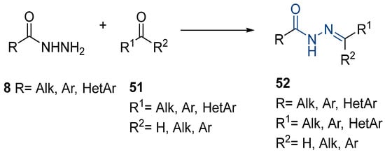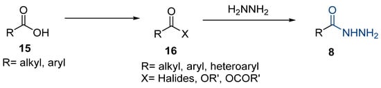 The first existing hydrazides, specifically formic and acetic acid hydrazides, were produced by Kurzius in 1895 [49]. Currently, many hydrazides with alkyl, aryl, and heteroaryl substituents are being synthesized to overcome drug resistance and toxicity. Hydrazides 8 (Scheme 1) are conventionally synthesized from compounds 16, such as esters [2,13,26,34,35,36,37,38,39,40,41,43,44,50,51,52,53,54,55,56,57,58,59,60,61,62,63,64,65,66,67,68,69,70,71,72,73,74,75,76,77,78,79,80,81,82,83,84,85,86,87,88,89,90,91,92,93,94,95], anhydrides [96], and acyl chlorides [2,97,98], or others [99,100,101,102,103] that possess a good leaving group, and hydrazine. When it is not possible to have compounds 16 available, the leaving group is produced from the acid derivative 15 [82,85,88,96]. According to the reaction conditions outlined in Table 1, the experimental reaction conditions to generate hydrazide 8 from precursor 16 do not differ much, and usually, the reaction takes place in an alcohol solvent, at room temperature, or under reflux. The reactions did not last more than 24 h, and generally, product 8 was purified by recrystallization or by column chromatography. Hydrazides 8a to 8abb were obtained in low to excellent yields (26–98%) from esters (17a–17aaw), anhydrides (18), acyl chlorides (19a–c), or others (20–23).