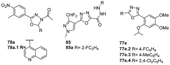 - Paruch, K.; Popiołek, Ł.; Biernasiuk, A.; Hordyjewska, A.; Malm, A.; Wujec, M. Novel 3-Acetyl-2,5-disubstituted-1,3,4-oxadiazolines: Synthesis and Biological Activity. Molecules 2020, 25, 5844. [Google Scholar] [CrossRef]