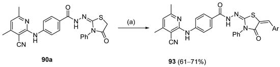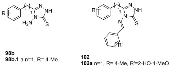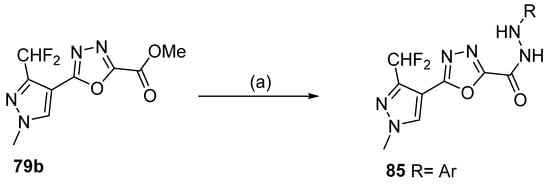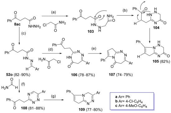| [83] | 17ay R = 4-F-C6H4, 17az R = 4-CH3–C6H4 17aaa R = 2-Cl,4-Cl-C6H3 | Hydrazine hydrate (n.s.) EtOH Reflux n.s. | n.s. | 8ay R = 4-F-C6H4, 8az R = 4-CH3–C6H4 8aaaR = 2-Cl,4-Cl-C6H3 (n.s.) |