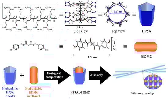 - Guo, F.; Xia, T.; Xiao, P.; Wang, Q.; Deng, Z.; Zhang, W.; Diao, G. A supramolecular complex of hydrazide-pillar[5]arene and bisdemethoxycurcumin with potential anti-cancer activity. Bioorg. Chem. 2021, 110, 104764. [Google Scholar] [CrossRef]