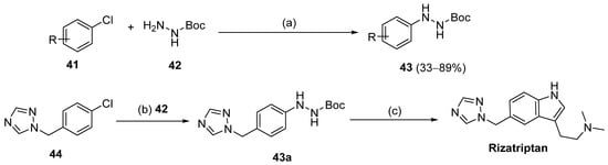 - Li, F.; Xiong, W.; Song, G.; Yan, Y.; Li, G.; Wang, C.; Xiao, J.; Xue, D. Light-Promoted Ni-Catalyzed Cross-Coupling of Aryl Chlorides with Hydrazides: Application to the Synthesis of Rizatriptan. Org. Lett. 2023, 25, 3287–3292. [Google Scholar] [CrossRef]