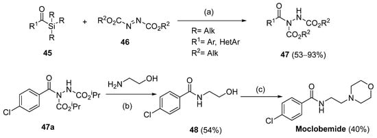 - Saleem, M.; Ratwan, A.; Yamini, P.; Yadagiri, D. Visible-Light-Induced Siloxycarbene Addition to N═N of Azodicarboxylates: Synthesis of Acyl Hydrazides from Acylsilanes. Org. Lett. 2024, 26, 2039–2044. [Google Scholar] [CrossRef] [PubMed]