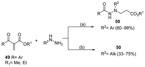 | [50] | ![]() 17a | Hydrazine hydrate (1.2 eq) EtOH 75–80 °C 2 h | Silica gel column chromatography | ![]() 8a X = N, O; R = Alk (70–95%) |