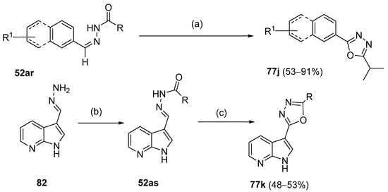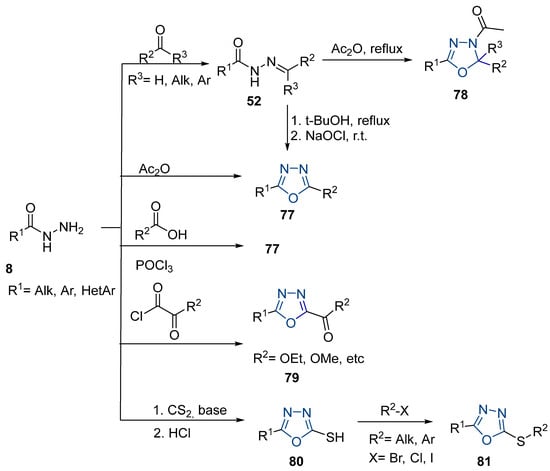 - Paidi, K.R.; Kolli, M.K.; Reddy, E.K.; Pedakotla, V.R. Sodium hypochlorite-mediated synthesis of 2,5-disubstituted 1,3,4-oxadiazoles from hydrazides and aldehydes. Chem. Heterocycl. Compd. 2020, 56, 371–376. [Google Scholar] [CrossRef]
