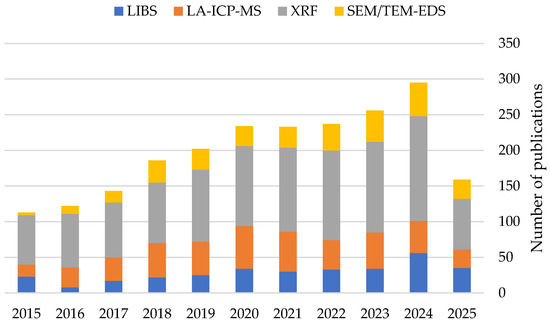 In the case of SEM-EDS, for lighter elements, the LOD values are less than 1000 µg/g; for medium elements, they are around 1000 µg/g; and for heavy elements, they are up to 3000 µg/g. In the case of the XRF technique, LOD values for elements with small atomic numbers are more than 1000 µg/g [46]. The smallest LOD values (about 20 µg/g) are found for elements with atomic numbers in the range of 35–45 and in the range of 70–90 (between 90 and 120 µg/g) [46].