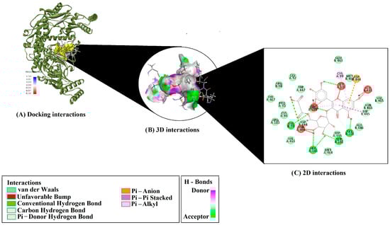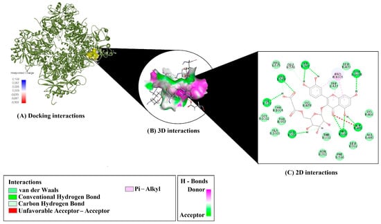 3D and 2D interaction diagrams of Q3MG with the 6ND0 protein. (A) Docking pose of Q3MG in the active site of 6ND0. (B) 3D surface view highlighting hydrogen bonds and π–alkyl contacts. (C) 2D interaction diagram with involved residues; red lines indicate unfavorable interactions; green and pink lines show H-bond acceptors/donors.